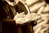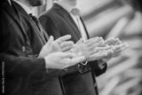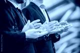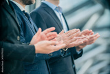 A group of young businessmen applauds at a business conference against the background of a modern office building