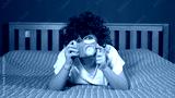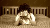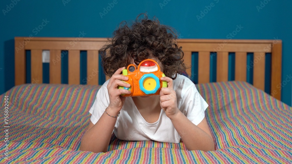 Funny and happy 9 year old boy in bed at home learns to take photographs with a camera - photography and lifestyle lessons in apartment during childhood