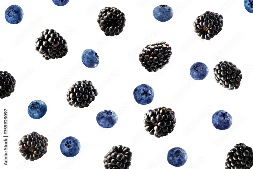 Falling blackberries and blueberries isolated on white. Background of blackberries and blueberries. Sweet berries isolated on white background cutout. With clipping path.