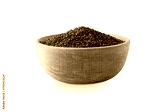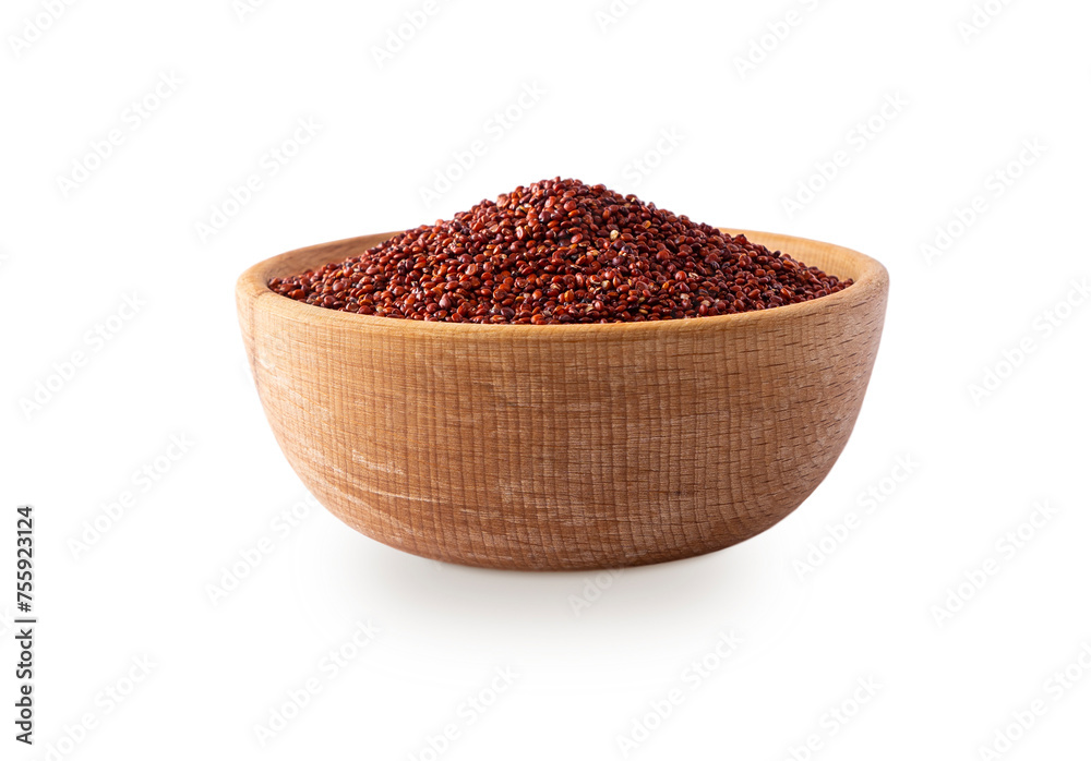 Bowl with red quinoa isolated on white background. Close-up. Grain red quinoa on white background. Whole grain quinoa. Image with copy space.