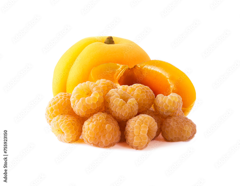 Raspberries and apricot. Yellow raspberries and apricot pieces isolated on white background. Juicy and delicious raspberries in close-up.