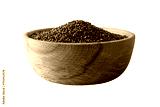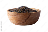 Bowl with black quinoa isolated on white background. Close-up. Grain black quinoa on white background. Whole grain quinoa. Image with copy space.