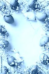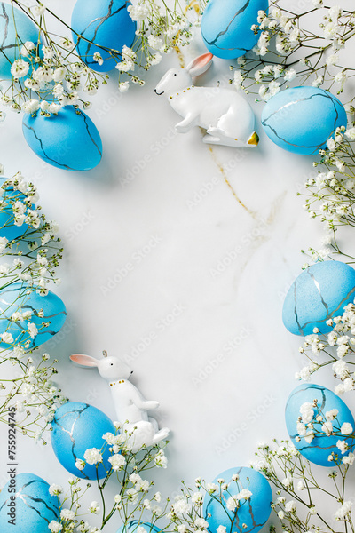 Blue and white Easter scene with two white rabbits and blue eggs. Flat lay, top view