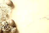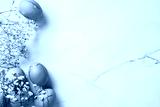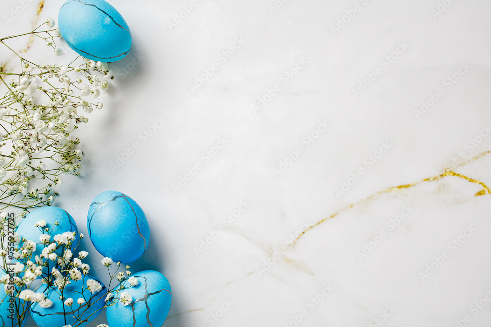 White background with blue eggs and white flowers. Happy Easter concept.