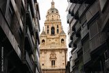 Murcia cathedral background. Narrow street view. Traveling around Spain. Cityscape spanish architecture. Cathedral de Santa Maria tower with clock.