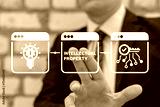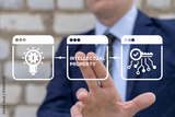 Intellectual Property Rights, Copyright, Patent or Trademark Infringement. Businessman using virtual touch screen presses inscription: INTELLECTUAL PROPERTY.
