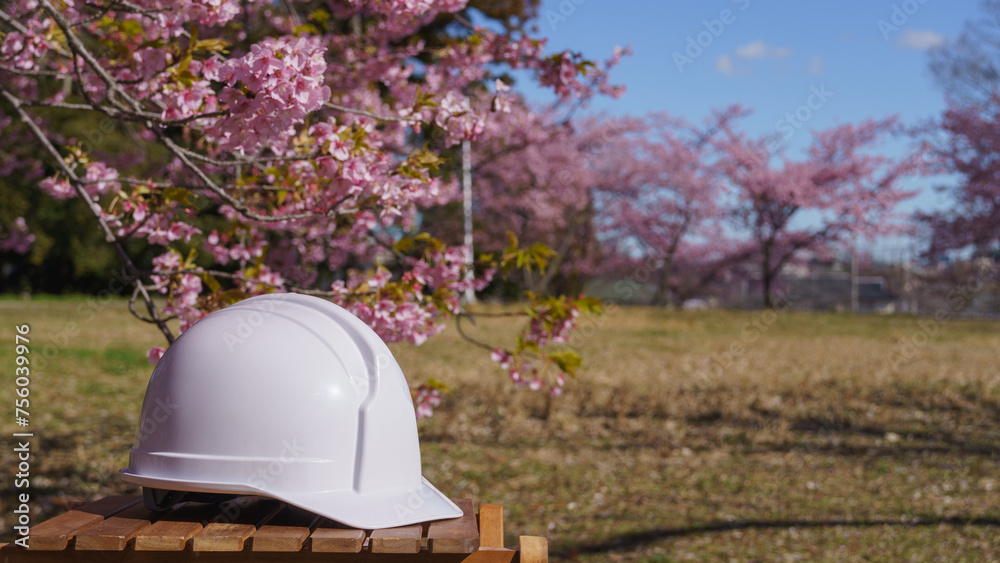 建設業・製造業などの入社イメージ|桜の花とヘルメット