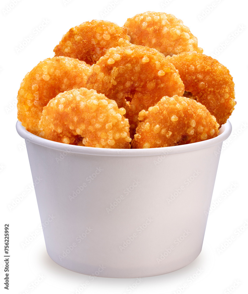 Fried Fish donuts in paper bucket isolated on white, Fried fish donuts Isolated on White background, With work path.