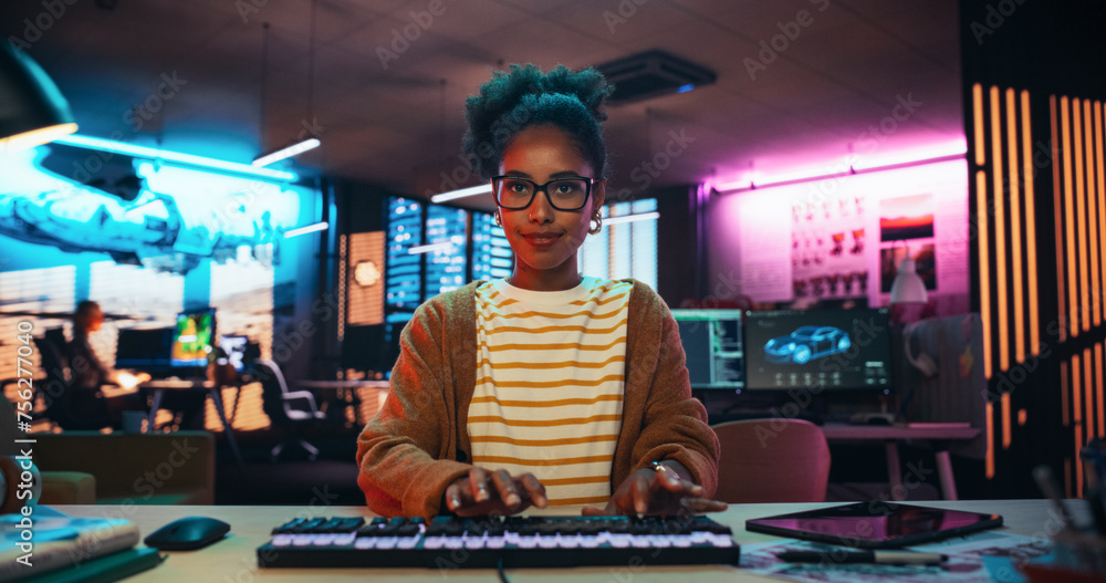 Portrait of a Black Female Developer Writing Code in a Creative Office with Neon Lights. Young Woman Focused on Typing on Keyboard and Working on Desktop Computer. Point of View of Screen Monitor