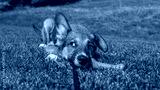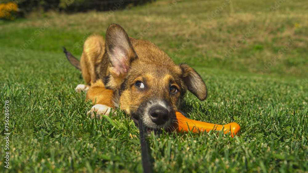CLOSE UP: A playful puppy lying on the grass with a chew toy and looking curious