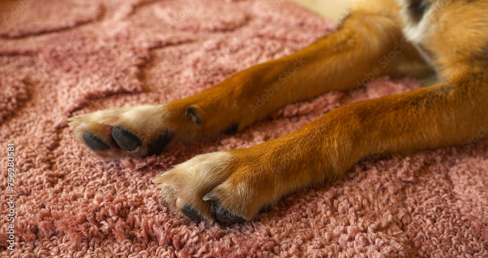CLOSE UP: Two dog legs with tan fur ending in fluffy paws on a pink shag carpet.