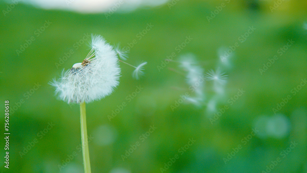 CLOSE UP: Close-up of a dandelion with seeds being carried away by the breeze.