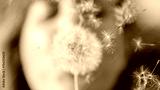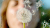 CLOSE UP: Soft focus of a woman blowing on a dandelion, seeds scattering in air.