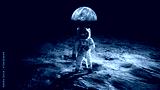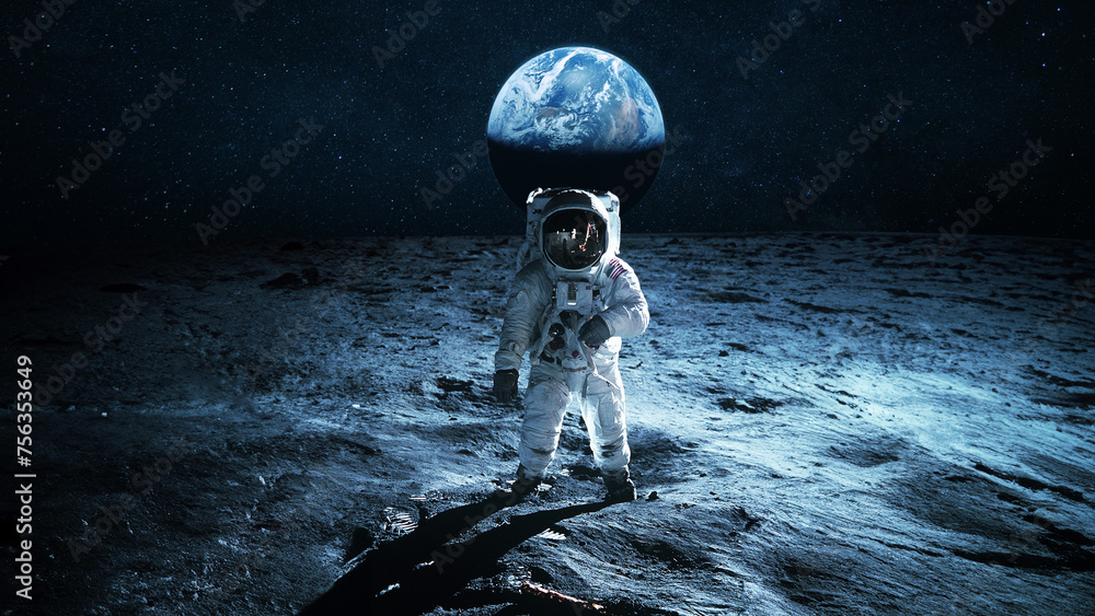 Astronaut walks on the surface of the moon overlooking the blue planet Earth. Lunar mission and exploration. Space man on the moon