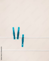 Two Blue Clothespins Are Hanging On A Clothes Line Against White background