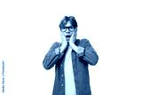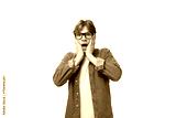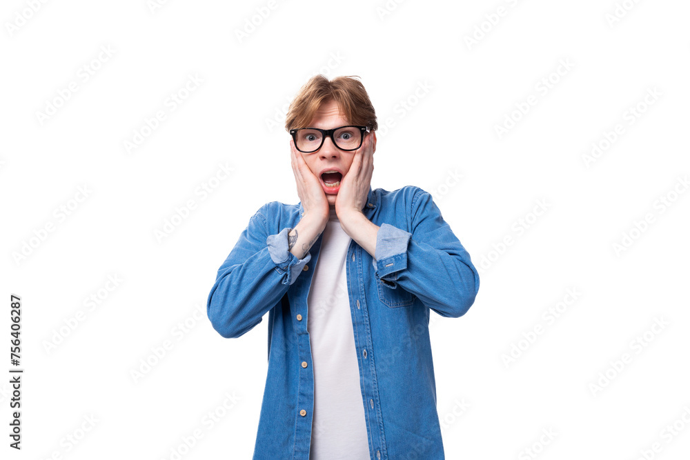young surprised guy with red hair in a denim shirt on a white background with copy space