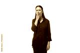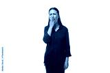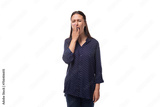 a young brunette woman dressed in a blue blouse with a pattern of peas yawns from longing