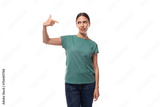 pretty young brunette woman in a green t-shirt shows her t-shirt with a mockup with her hand