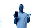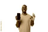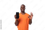 young surprised african man dressed in an orange t-shirt holding a phone. advertising concept with mockup
