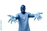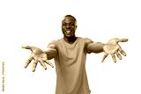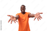 a young American guy with a short haircut, dressed in an orange T-shirt, holds out his arms for a hug