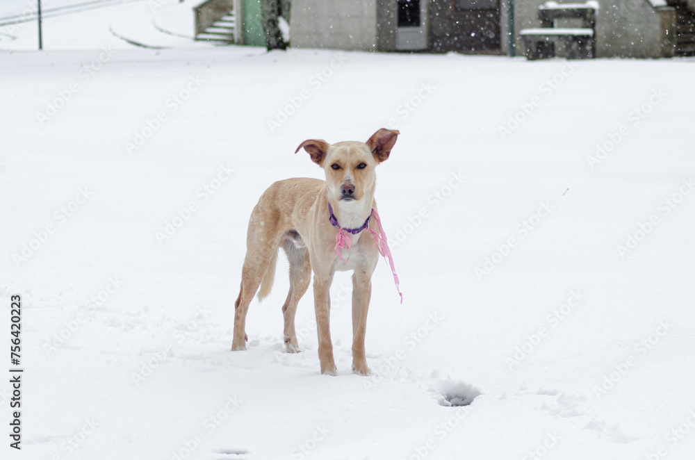 full body portrait of a dog standing still in the snow looking at the camera