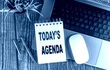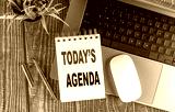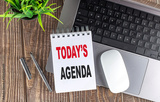 Laptop, mouse and notebook notes with text TODAY S AGENDA on wooden background.