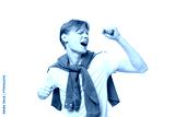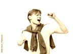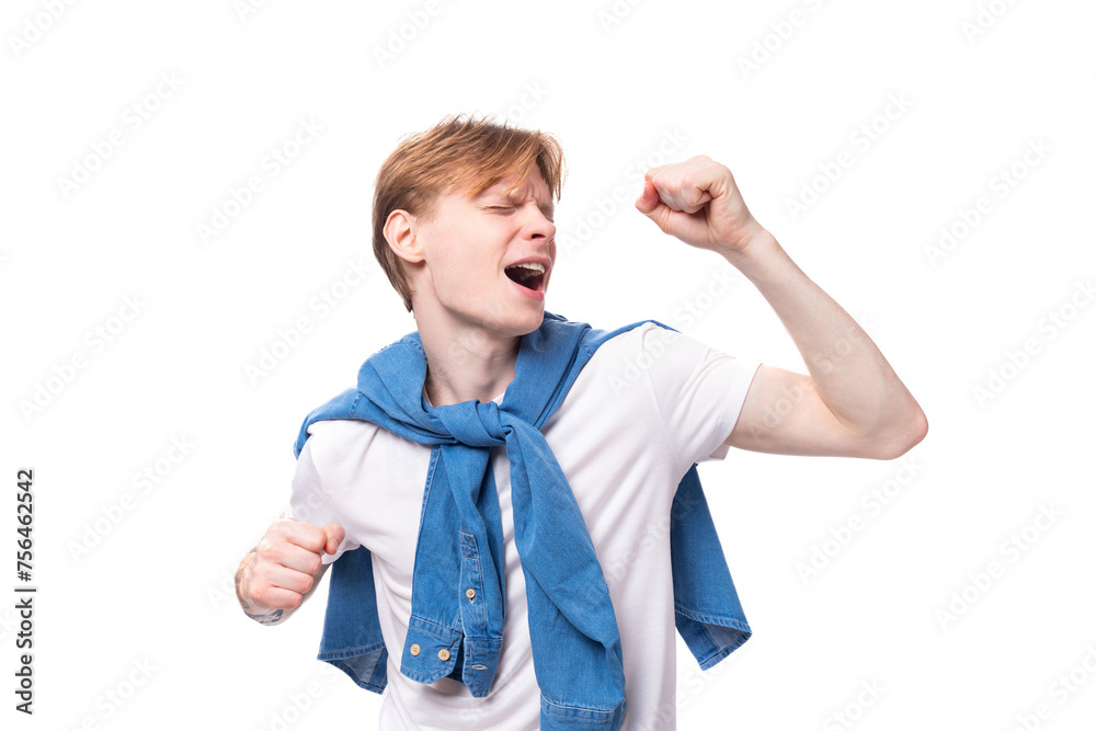 close-up portrait of a young fashionable caucasian guy with short red hair with a tattoo on his arms dressed in a white t-shirt