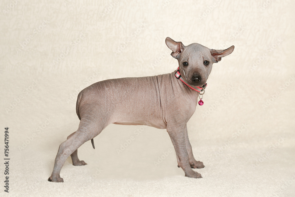 The Xoloitzcuintli puppy stands sideways on a light background. A cute puppy of a Mexican naked dog. A small pet.
