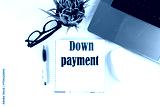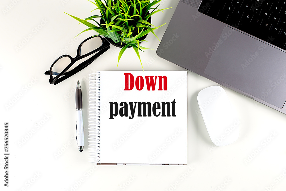 DOWN PAYMENT text on notebook with laptop, mouse and pen