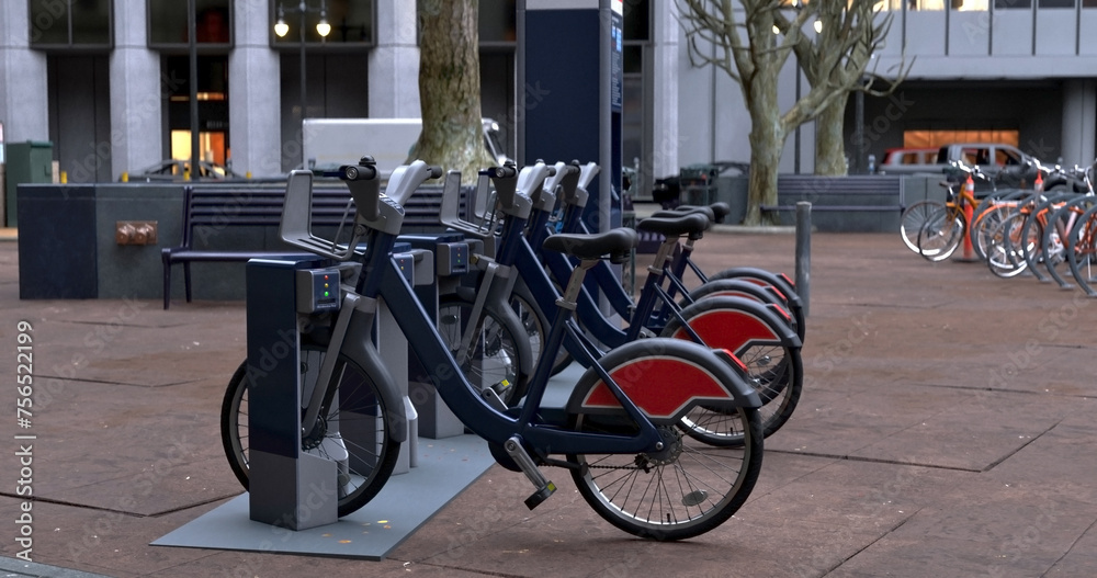 Generic Electric bicycle charging station. Shared electric bikes parked for rent on city street