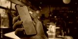 Person holding a smartphone with a green screen in a blurred cafe setting