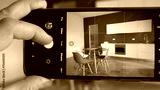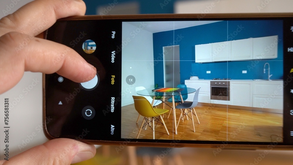 RReal estate photographer taking pictures and videos at house in apartment living room with mobile phone - selling home with real estate agency and home staging indoor home design