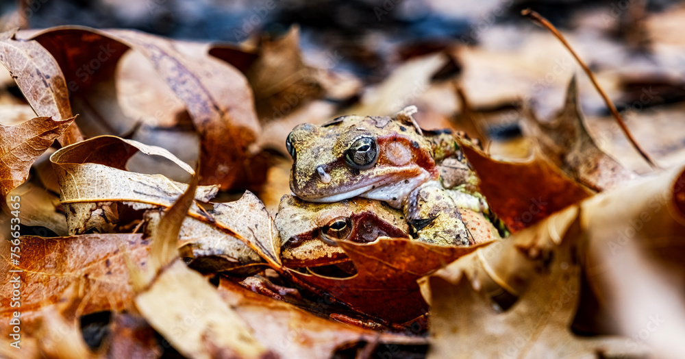 Two Common frogs mating in autumn foliage