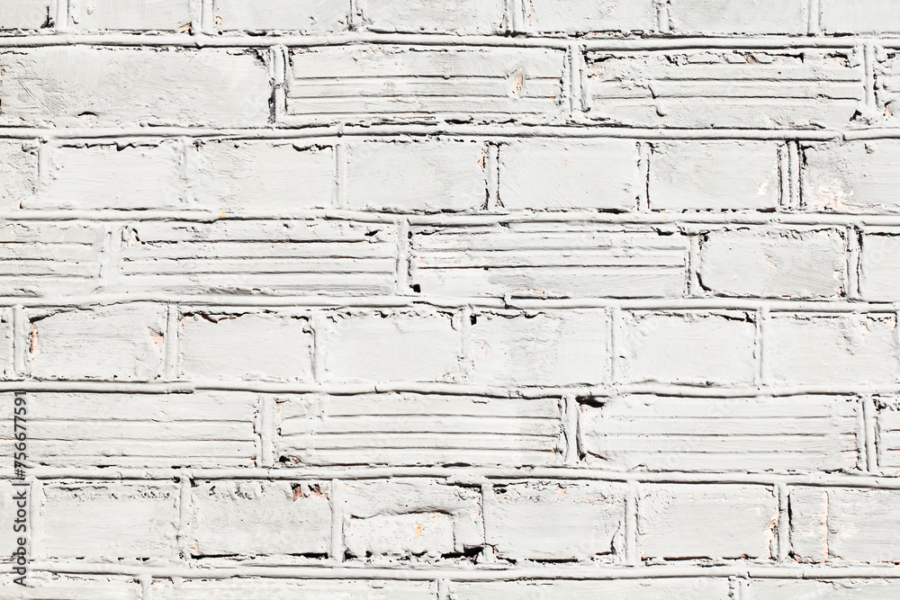 White paint brick wall background. Outdoor house facade texture. Gray vintage block structure. Old architecture background. Grunge weathered cracked texture.