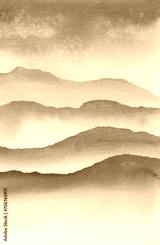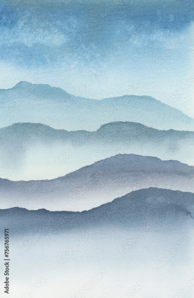 Ink watercolor hand drawn smoke flow stain blot wave landscape on wet paper texture background. Blue color.