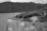 Blurred view through yellow flowers to a green spruce forest by Moriston River