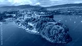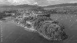 AERIAL: Picturesque seaside town with harbour on the Isle of Skye on a sunny day