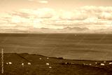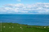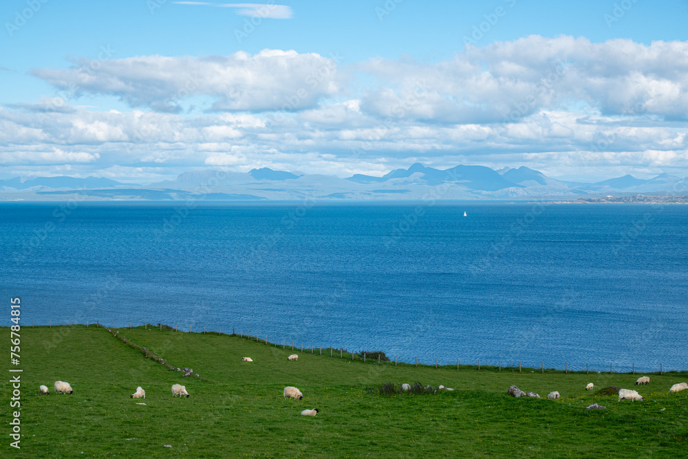 Picturesque green meadow on Isle of Skye with grazing flock of Blackface sheep