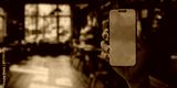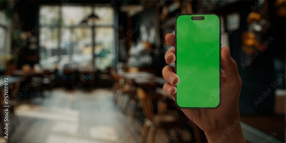 Person holding a smartphone with a green screen in a blurred cafe setting