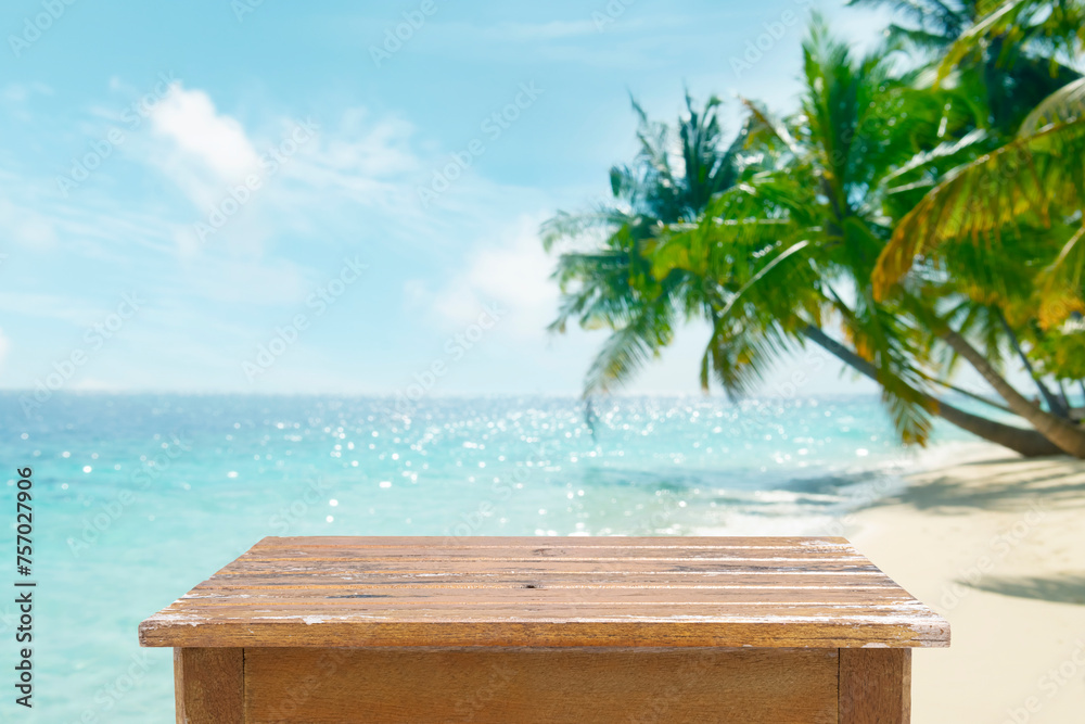Empty wooden planks table for product placement on blur tropical palm beach background
