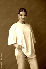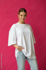 Beautiful blonde girl in a white oversized T-shirt and blue jeans posing on a gray background