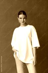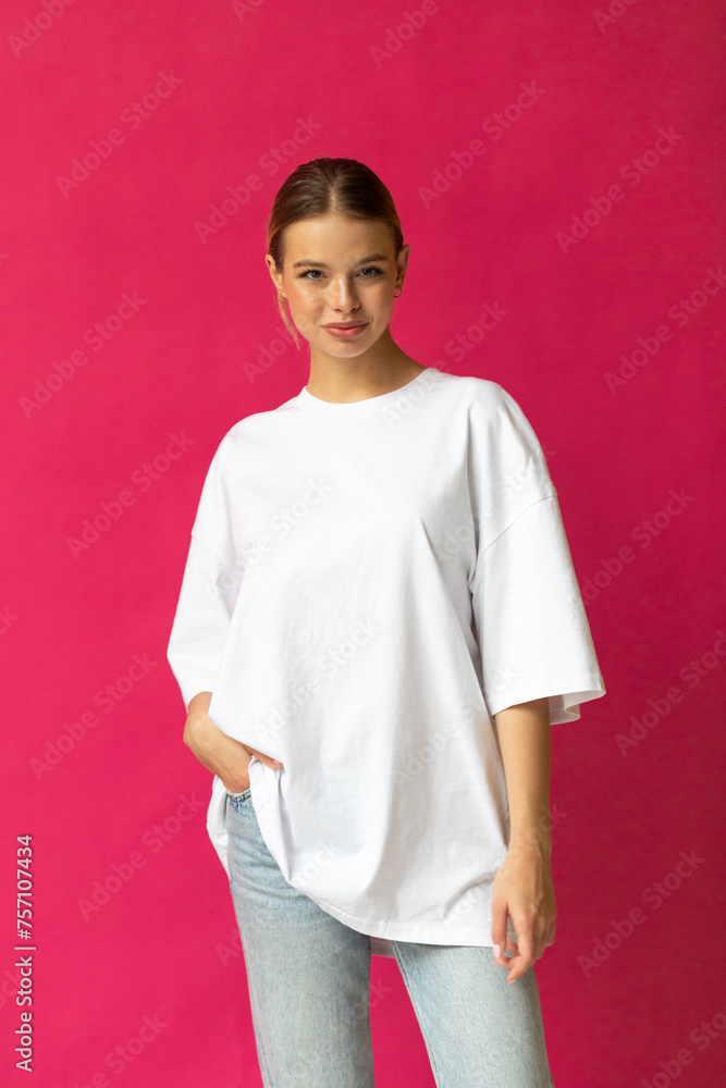 Beautiful blonde girl in a white oversized T-shirt and blue jeans posing on a gray background