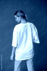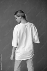 Beautiful blonde girl in a white oversized T-shirt and blue jeans posing on a gray background