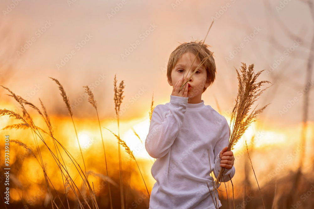 Adorable little child, boy, holding fild flowers in park on autumn day, sunset