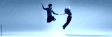 Dynamic image of young couple dancing retro dance, jumping against blue background in neon light. Concept of hobby, dance class, party, 50s, 60s culture, youth. Banner. Empty space to insert text ad
