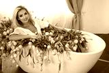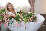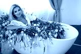 A beautiful happy smiling woman with blond hair stands near a white bathtub full of flowers.