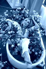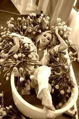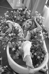 A beautiful happy smiling woman with blond hair stands near a white bathtub full of flowers.