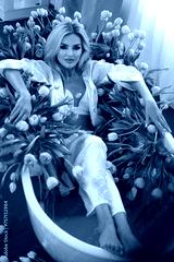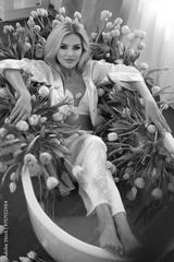 A beautiful happy smiling woman with blond hair stands near a white bathtub full of flowers.