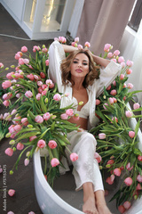 A beautiful happy smiling woman with blond hair stands near a white bathtub full of flowers.