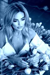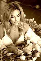 A beautiful happy smiling woman with blond hair stands near a white bathtub full of flowers.